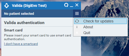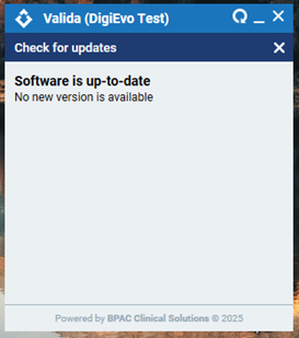 Click the three lines in the top right corner of the Valida client and select ‘Check for updates’. This will ensure Valida is up to the most current version: