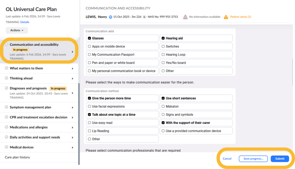 As part of this change, the option to save information as ‘in progress’ for six forms will be removed. This is required to enable the individual to be able to co-author appropriate sections of their care plan enabling greater involvement.